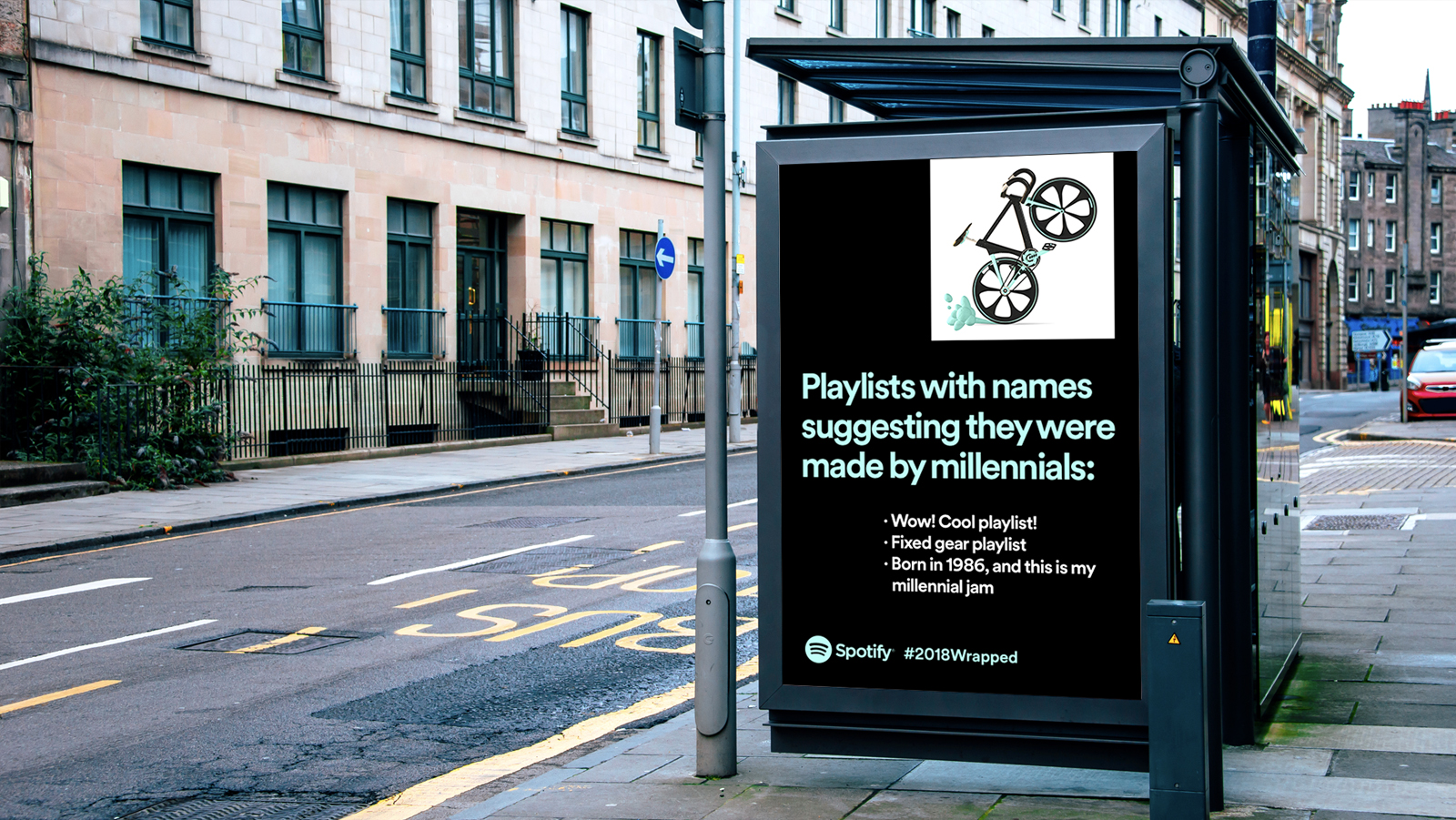 2018 Wrapped is a global moment of celebration, laughter, and levity at the end of a long year. The campaign comprises over 350 unique ads worldwide mixing data, artists, cultural moments and listening data from the year. Nearly 50 artists and creators are featured as we celebrate their creativity.